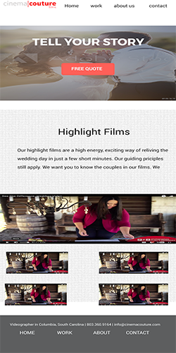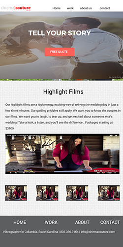 The reason I called the company Cinema Couture is we take the position that every film has it’s own personality. Every couple wants their story told a little differently. Every event is about something. Every product or business is unique. We understand how to find that story and custom make a film that reflects your true personality."